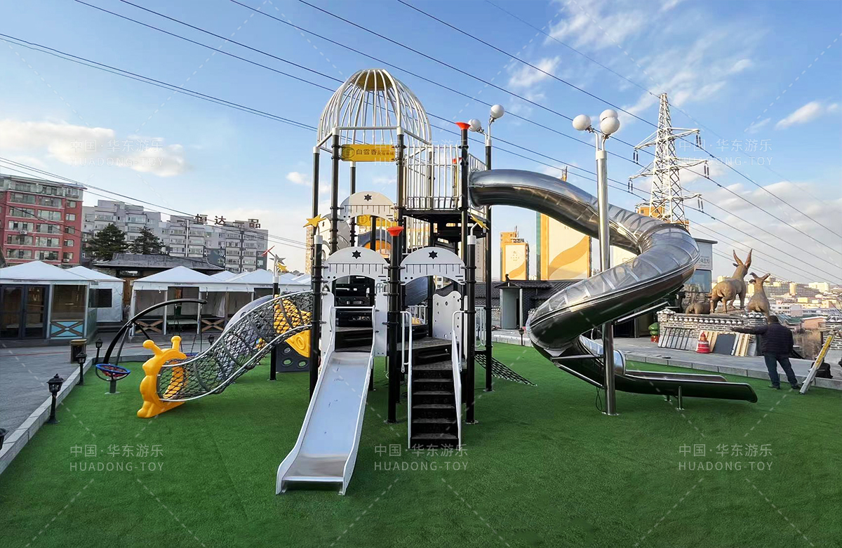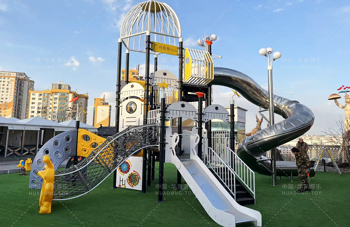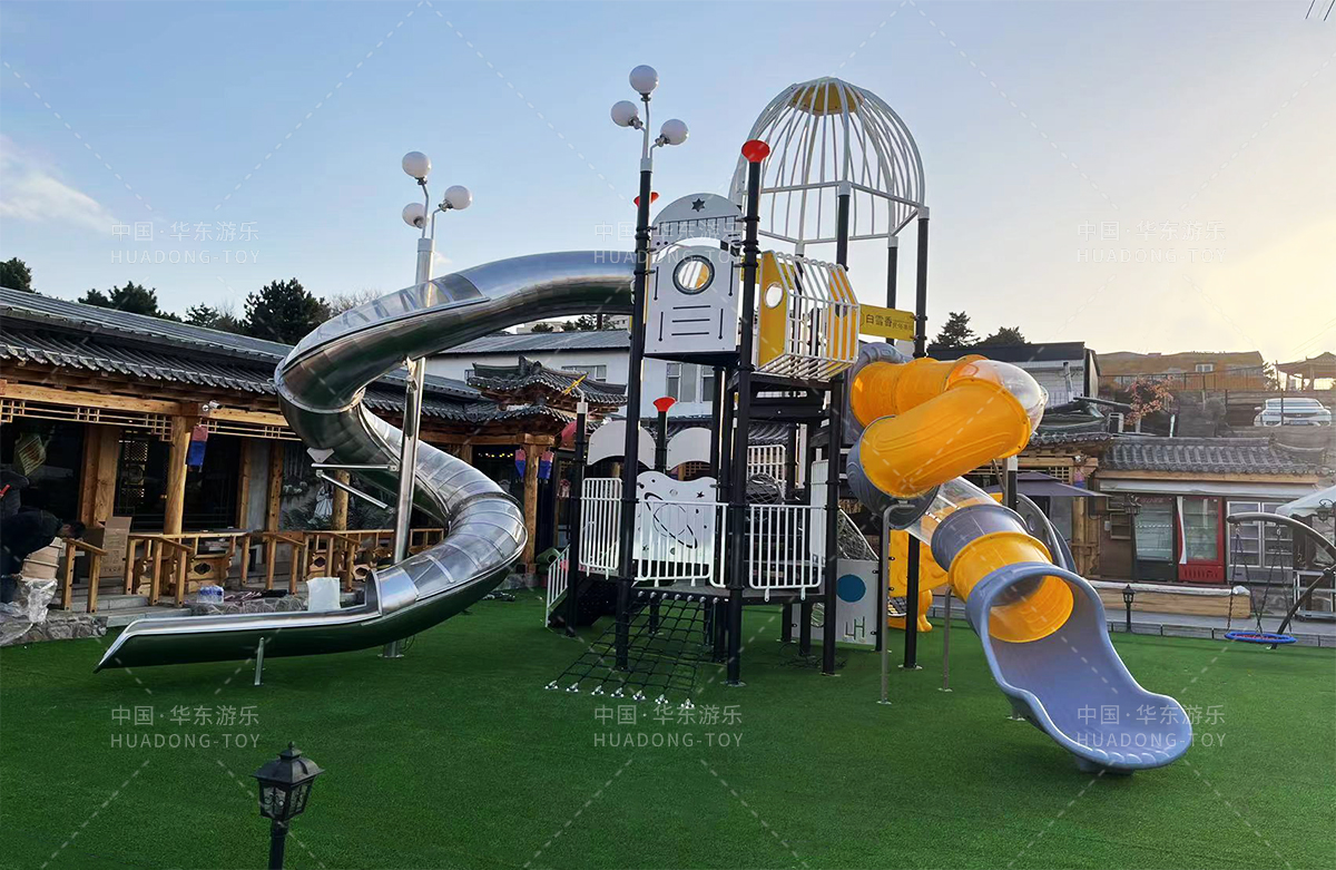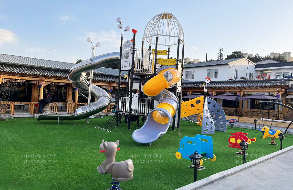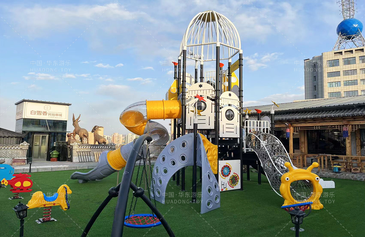 吉林省白雪香民俗烧烤城是一个专业的休闲夜宵烧烤城,此次选用的是ky开元游乐自主研发和设计的 PE板系列滑梯,卡通的造型,齐全的功能深受小朋友们的喜爱,同时还设置了小朋友喜欢的儿童摇摇乐、组合秋千、 旋转碗等游乐设备。