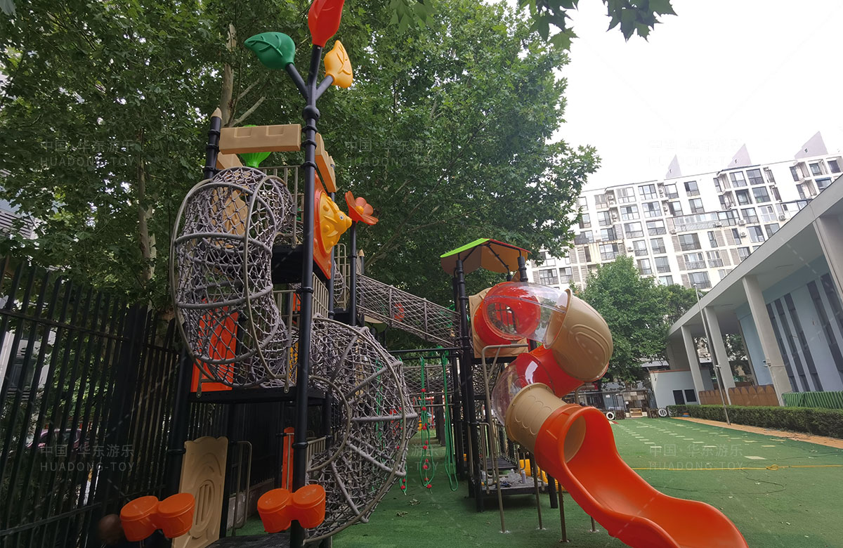 北京市朝阳区管庄忠德幼儿园选用的是ky开元游乐自主研发和设计的大自然系列组合滑梯,该滑梯是一款具备了攀爬网、钻洞、滑梯、丛林拓展、拍拍鼓、攀爬墙、固定踏踏车、平衡桩等功能为一体的综合性 游乐设备,能够很好的锻炼小朋友的全面发展。